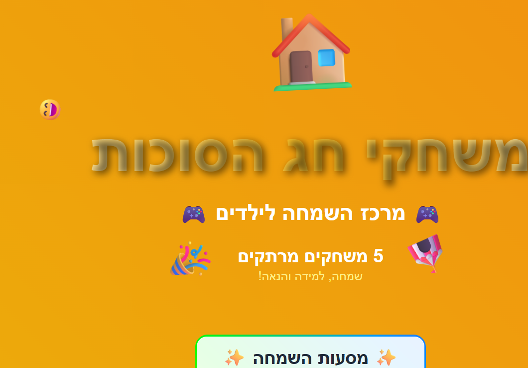 משחקי חג הסוכות 12.10.2025 תנ"ך • תרבות יהודית ישראלית ד • ה • ו • ז • ח • ט 9 0 0 סוכותשמחה🎮 מרכז השמחה לילדים 🎮 🎪 5 משחקים מרתקים שמחה, למידה והנאה! 🎉 מעבר לקישור