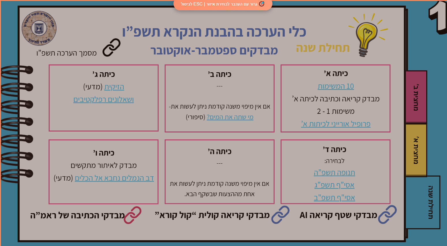 מבדקים ומיפויים בשפה 16.10.2025 מדע וטכנולוגיה • שפה א • ב • ג • ד • ה • ו 11 0 0 אוסףאסיףמבדקמשימותפרופיל אורייניקריאה קוליתשטף קריאהתנופהמעודכן לתשפ"ו – עפ"י מסמך הערכה תשפ"ו, אוסף מבדקים ייעודיים לשכבות היסודי
